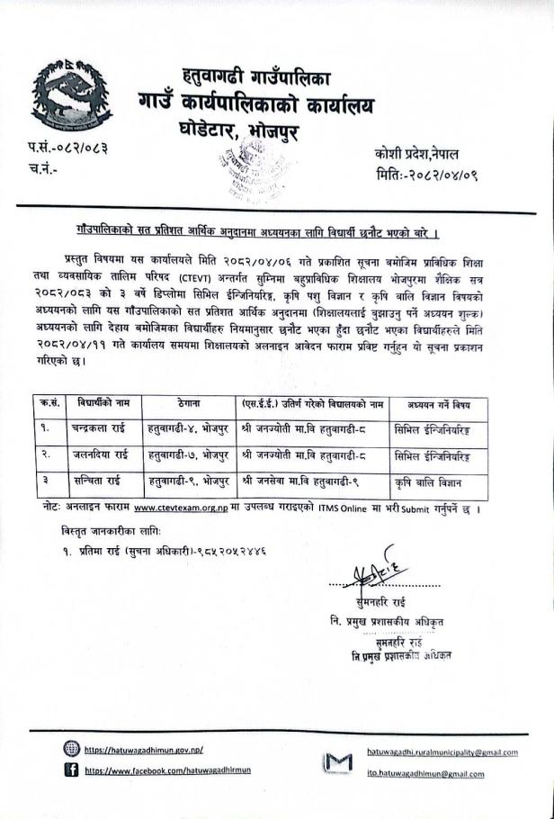 गाँउपालिकाको सत प्रतिशत आर्थिक अनुदानमा अध्ययनका लागि विद्यार्थी छनौट भएको बारे ।