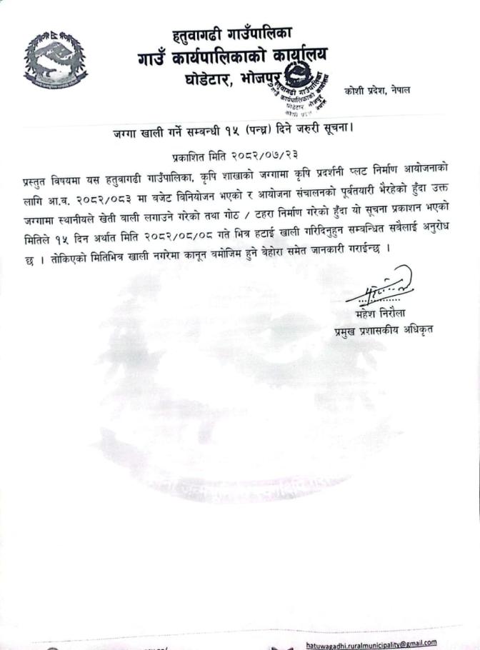 » जग्गा खाली गर्ने सम्बन्धी १५ दिने सुचना ।